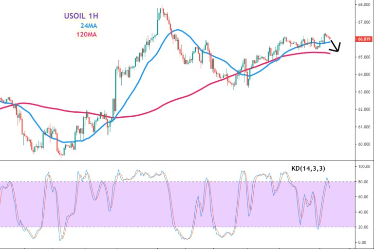 美油(USOIL)走势分析及操作建议 美油(USOIL)短线技术评估和走势 观察美油1小时图,短周期24MA及长周期12...