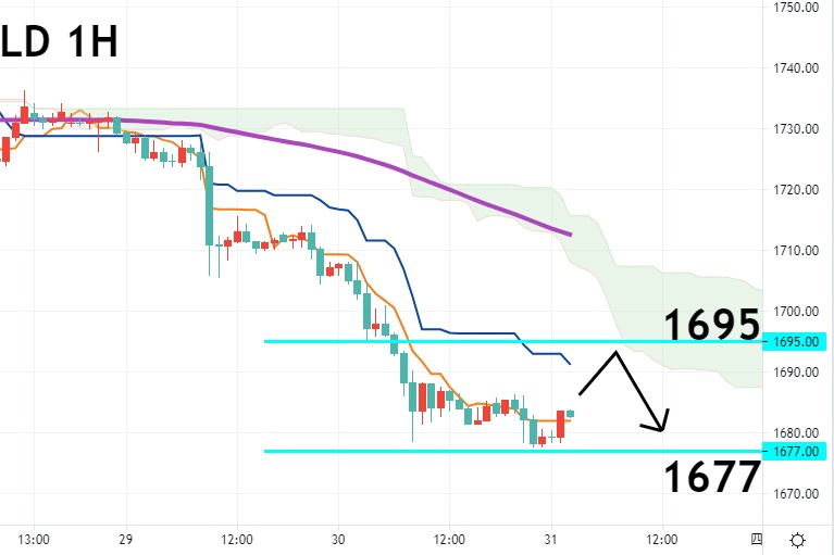 黄金(GOLD)分析及操作建议 黄金短线技术评估和走势 观察黄金小时图,云图快线与慢线死亡交叉,处于云层及EMA120(...